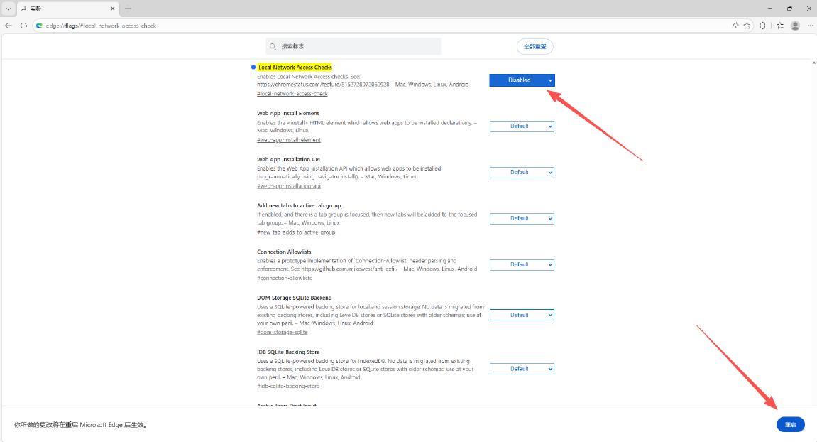 1. 在浏览器地址栏输入:edge://flags/#local-network-access-check并回车。
