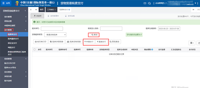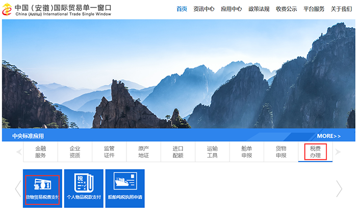 2.法人卡或操作卡登录中国(安徽)国际贸易单一窗口http://ah.singlewindow.cn。进入税费办理——货物贸易税费支付——支付管理——税费单支付。