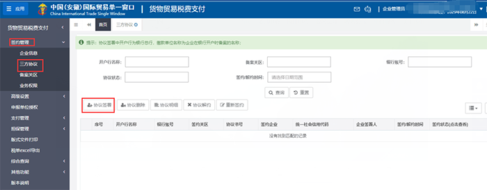操作流程:1.法人卡登录中国(安徽)国际贸易单一窗口http://ah.singlewindow.cn。进入税费办理——货物贸易税费支付——签约管理——三方协议——协议签署。