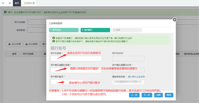 税费支付可分为两步,一是必须先签约三方协议,二是进行税费支付。
